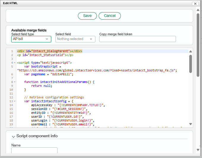Copy the contents from the file “Edit AP Bill” from the FA Setup folder > AP Bill Integration and paste it in the script component. Save the script component and then save the page