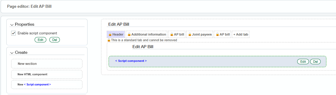 Drag a new <script Component> from the left side of the page and place it beneath the “Edit AP Bill” section in the middle of the page. Then click Edit to edit the script component.