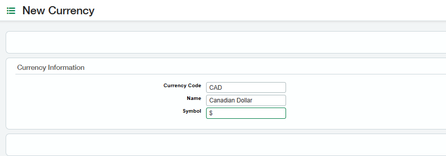 To add currencies, navigate to Fixed Assets > Currencies. Click on New Currency and populate the following information, for example: