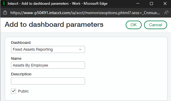 Set the Component Name to “Assets By Employee,” select the Dashboard “Fixed Assets Reporting,” check the checkbox for “Public,” and click “OK.” Repeat steps 15-17 to add the remaining reports, “Assets By Location,” “Financial Depreciation Forecast,” and “Tax Depreciation Forecast” to the Fixed Assets Reporting Dashboard.