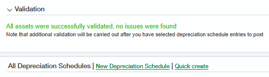When posting depreciation schedules, a final check is performed that revalidates the asset and checks that the posting date falls within a period when the books are open. If all depreciation schedules pass validation, the message “Validation complete -- no issues were found” will appear.