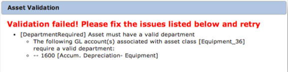 If assets have errors related to a missing dimension, and you subsequently modify the related GL accounts to remove that required dimension, it will be necessary to refresh the asset validation status. You can do this for a single asset by clicking the Revalidate Asset button on the detail page.
