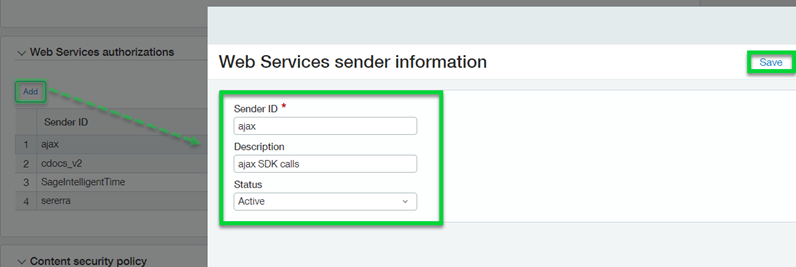 Next, click Add and enter “ajax” as the Sender ID and make sure the Status is “Active,” and Save