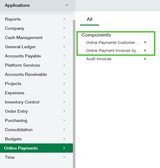 The Online Payment Customer Prefs Object and Online Payment Invoice Object have been added. You may need to add the permissions to see these objects in the application list by going to Company>Admin>Roles or User Subscriptions> and update the role or user subscriptions to see both objects. Additionally, the objects can be seen at the bottom of a Customer record or Invoice record in Accounts receivable.
