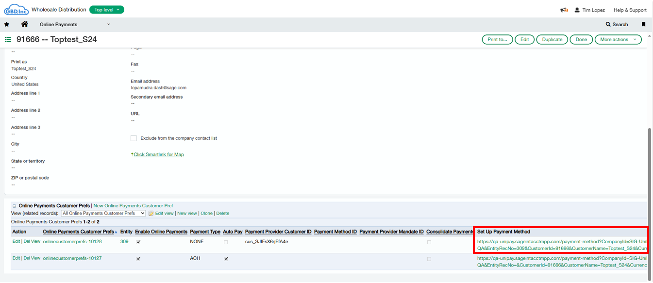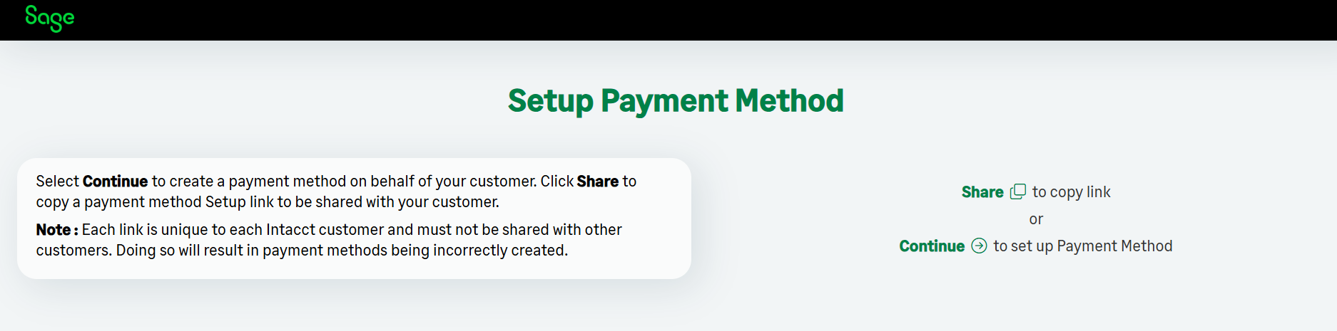 When using Unipay, there may be a need for a customer to setup their payment method or mandate prior to invoicing. Because its before invoicing, autopay and the pay now link are not available. This is where the Setup Payment Method Link comes in. This link gives a user within Intacct the ability to share a link with the end customer that takes them to the setup payment method or mandate screen. Additionally, if a user does not want to share but would rather setup a payment method with or on behalf of the customer, there is a continue button which allows a user to go through the setup payment method or mandate process. To access this link, a user would navigate to Accounts Receivable>Customers>View Customer>scroll down to the bottom of the page to the Online Payments Customer Prefs object> and to the far right of the record is Setup Payment Method link. When a user clicks the link, a new window will pop up with the option to share or continued with setup. Figure 1 to the right shows the link located in the customer record, and figure 2 shows the screen that populates.