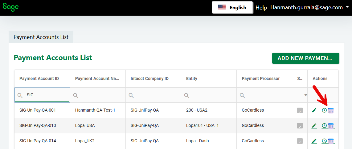After logging in, you will see a table listing your available Payment Accounts. On the far right of each row, there are two icons: a pencil icon and a clock/calendar icon. Select the clock/calendar icon for the payment account you want to manage (Figure 1).
