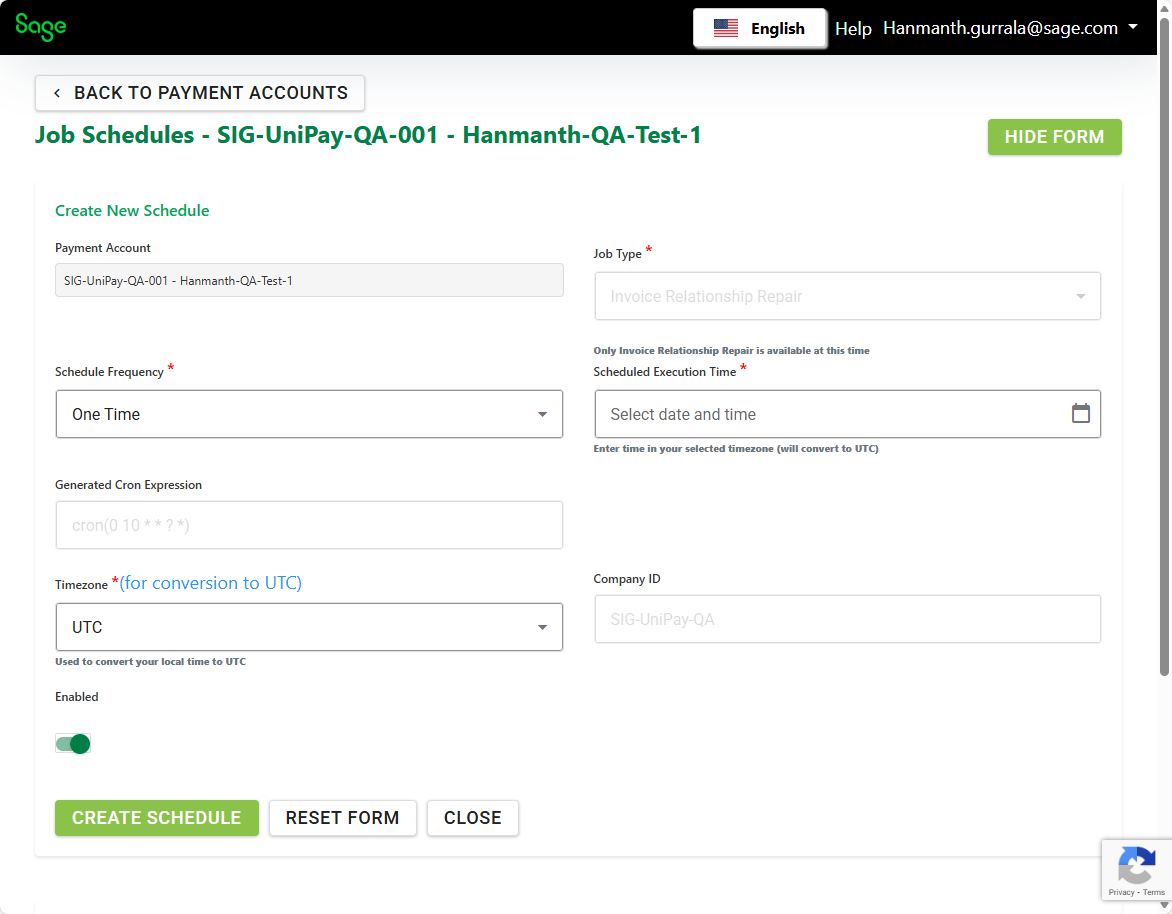 This action opens the Job Schedules page, titled with the Payment Account ID and Payment Account Name. On this page, you can view all active scheduled Online Payments Repair Jobs, as well as any previously run one-time jobs.